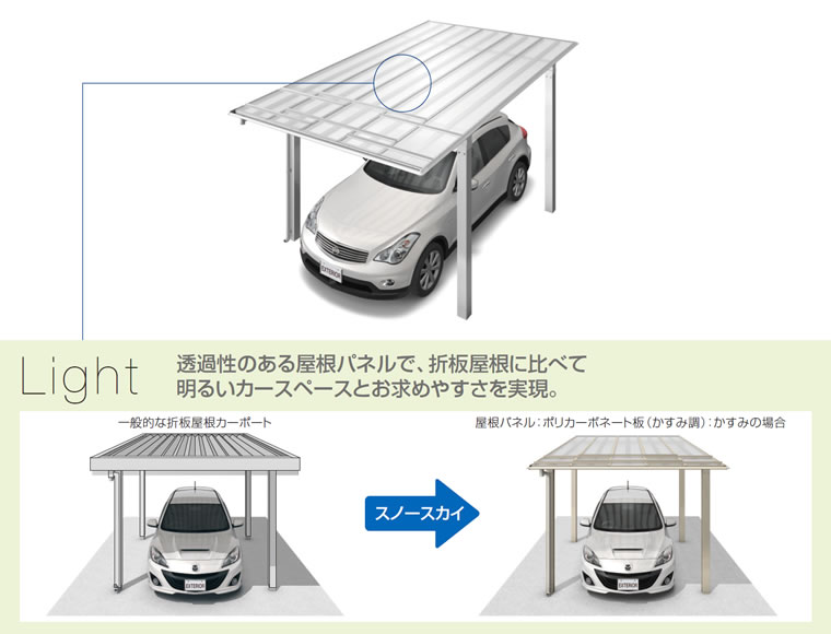 陽の光が降りそそぐ晴れた日には、透過性のある屋根パネルがカースペースを明るく。