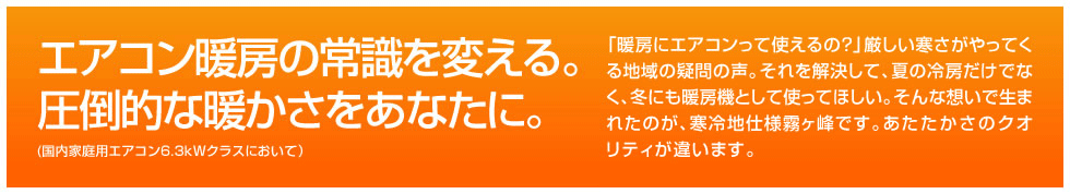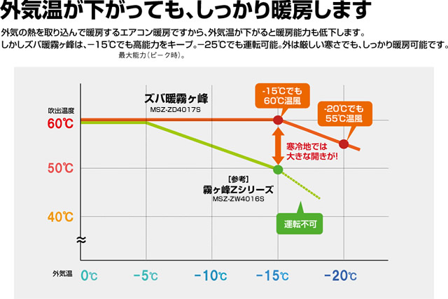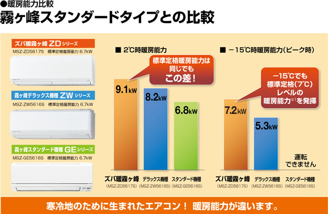 その最先端をいっているのが、三菱電機の「ズバ暖霧ヶ峰」数々のフィールドテストや、極寒の環境を想定した様々な試験をクリアした製品だからこそ、フジオカ電機では自信を持ってお客様にオススメいたします。